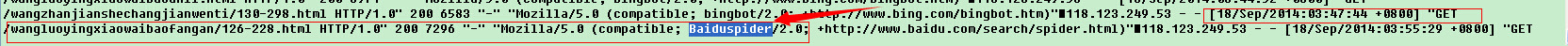 找到有baiduspider的地方就开始分析,如上图里面的这个网址,就表示百度蜘蛛爬行到了我的这个页面/wangluoyingxiaowaibaofangan/126-228.html,而后面的200是一个代码状态,表示百度成功的抓取了我的这个页面,后面的7296就是这个页面的数据,也就是说百度蜘蛛爬行并抓取了我的这个页面,并且抓取的数据大小为7296.